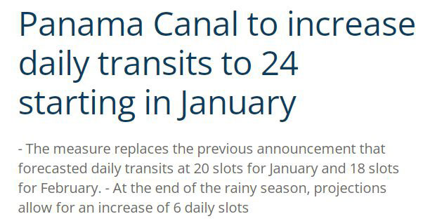 从2024年1月16日起,巴拿马运河每日船舶通行数量增加至24艘。
