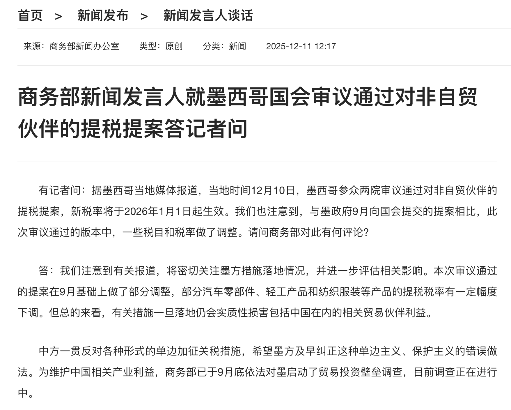 中方一贯反对各种形式的单边加征关税措施,希望墨方及早纠正这种单边主义、保护主义的错误做法。为维护中国相关产业利益,商务部已于9月底依法对墨启动了贸易投资壁垒调查,目前调查正在进行中。