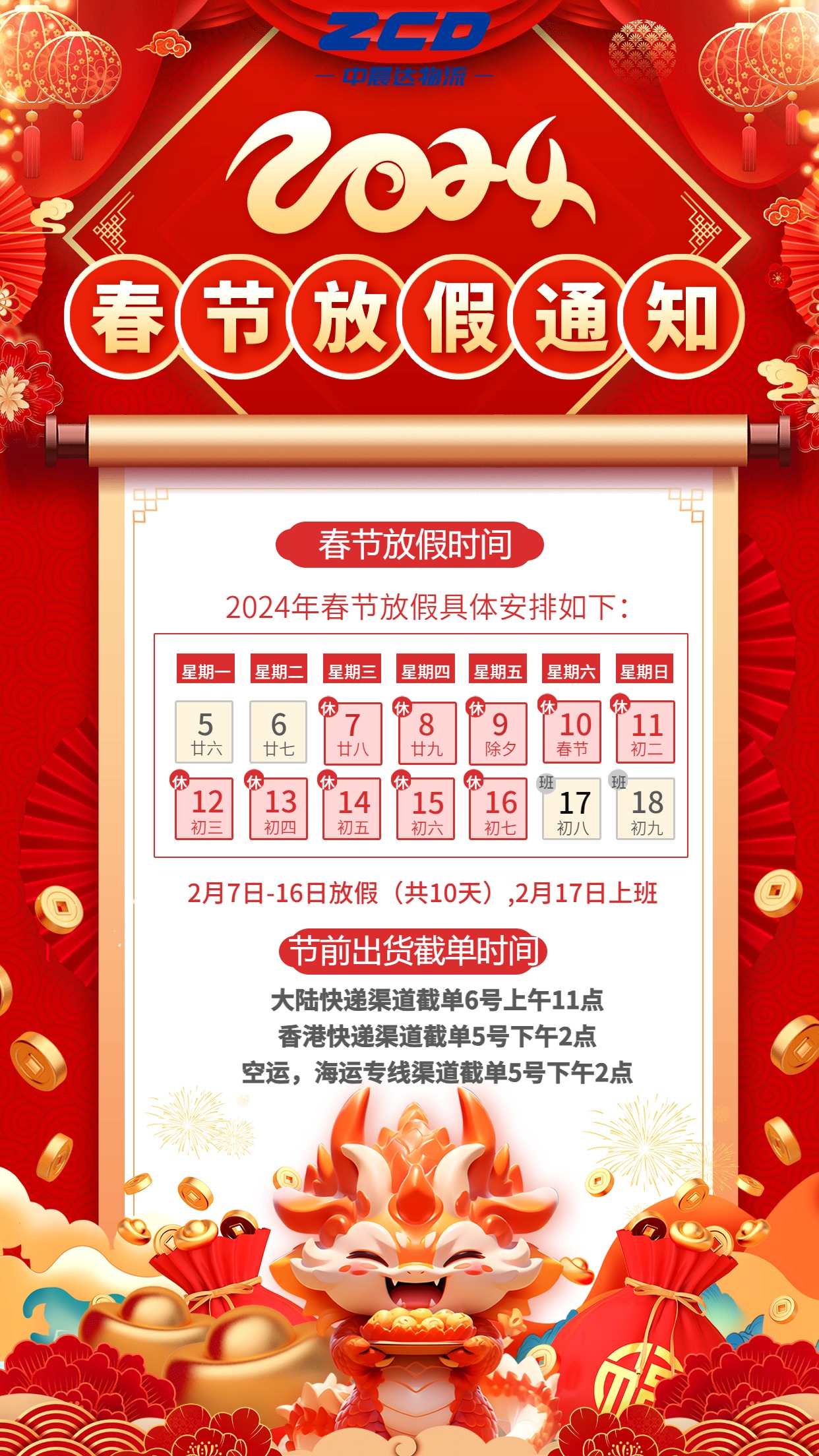 深圳货代-中晨达物流春节放假通知